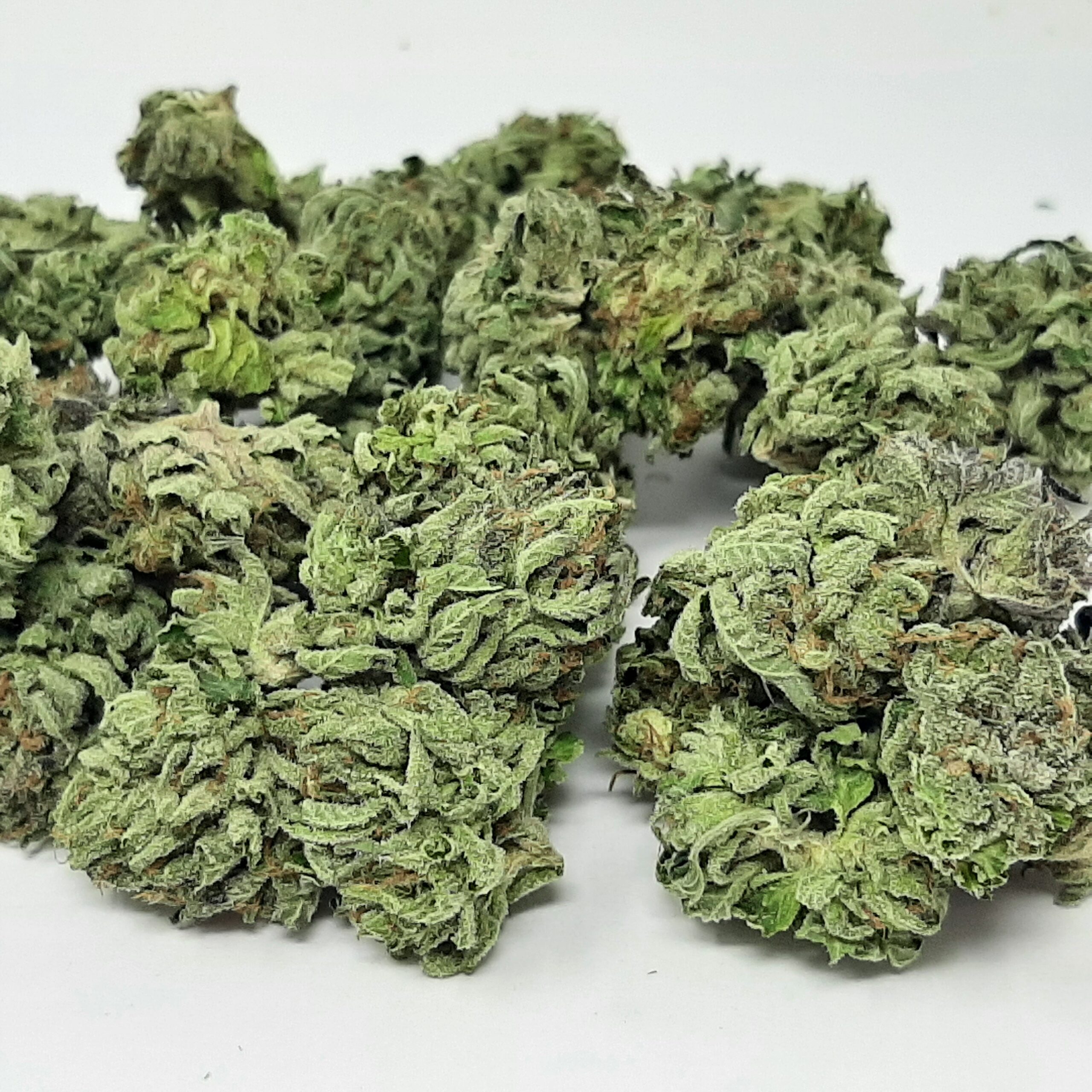 Pink Tuna is a rare indica dominant hybrid strain (70% indica/30% sativa) created through crossing the classic Pink Kush X Tuna Kush strains. This bud steals its name from the infamous Black Tuna Gang who made their name smuggling marijuana from Colombia in the 70’s. This bud lives up to the name, with classic indica effects that hit hard and fast, slamming into you with a hefty potency and a super high 25-31% average THC level. The high starts with cerebral effects that suddenly crash through your mind, leaving you utterly euphoric and pretty unfocused at times with a tendency to drift away into space. As your mind settles, your body will start to drop off into a deeply relaxing tingly state, which lulls you into a heavy couch-lock. This effect quickly turns sedative, leaving you dozing off and on in a state of pure happiness and peace. Thanks to these effects and its high THC level, Pink Tuna is often chosen to treat conditions such as chronic pain, insomnia, depression, chronic stress, and muscle spasms or cramps. Pink Tuna buds have a sweet and sour fruity diesel flavor with a heavy pungent aroma to match. This bud has compact grape-shaped minty green nugs with thin orange hairs and a coating of frosty white crystal trichomes.