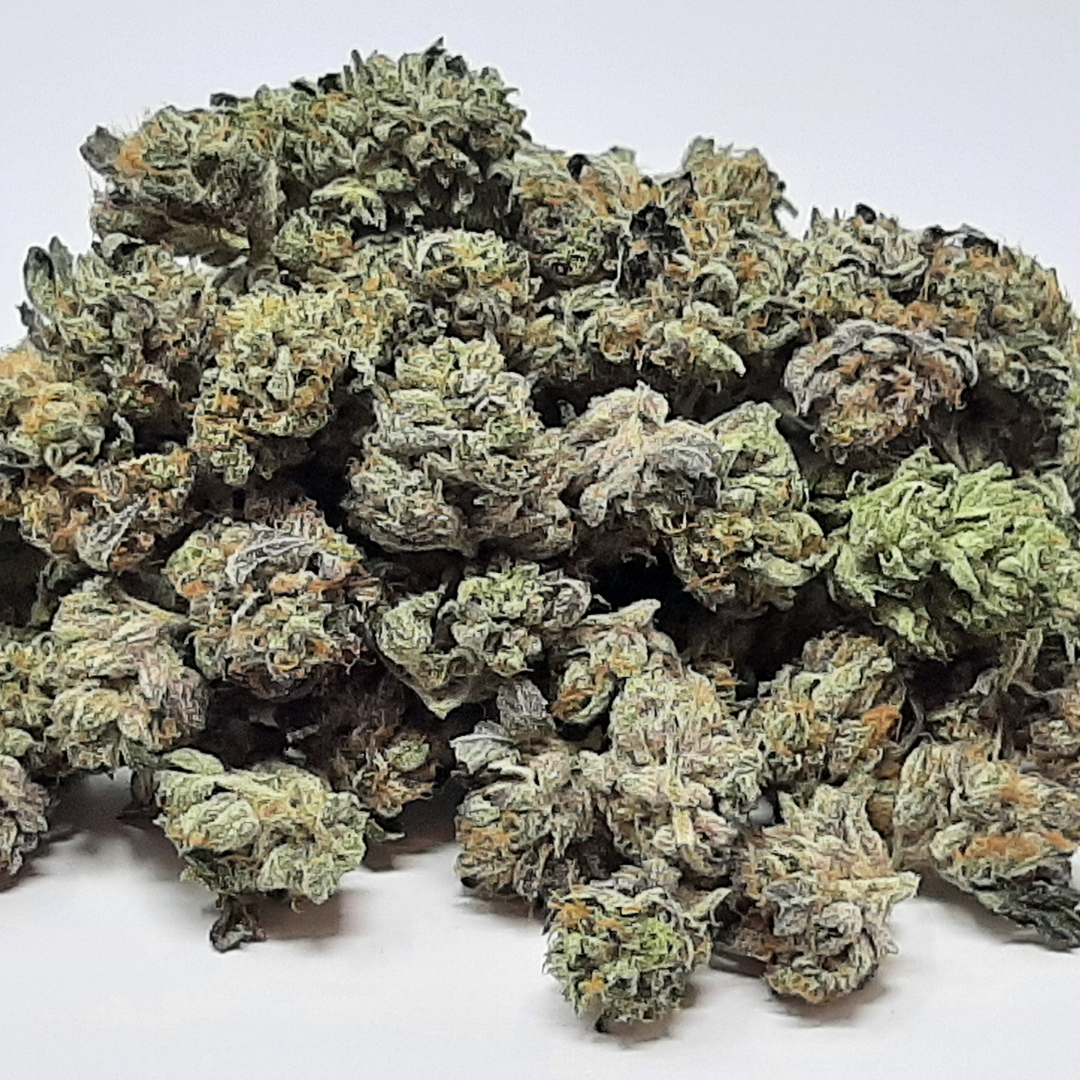 Airheadz, also known as “AirHeadz,” is a slightly indica-dominant hybrid strain (55% Indica/45% Sativa) created by crossing the delicious Runtz X Pink Runtz strains. Named for the iconic candy, Airheadz packs a delicious flavor with soothing, lifted effects that hit the brain before taking on the body. Like its namesake candy, Airheadz has a sweet and sugary fruity berry flavor with a lightly sour exhale. The aroma is very similar, with a sweet and fruity overtone accented by a punch of gassy diesel and spicy earthiness. The Airheadz high settles in a few minutes later, starting in the mind before taking on the body. You’ll find your cerebral state activated with a budding creativity that lifts the spirits and fills you with a sense of calm. This soothing sense will soon wash throughout your entire body, leaving you fully relaxed from head to toe and without a care in the world. Thanks to these effects and its high 28-35% average THC level, Airheadz is often chosen to treat those suffering from conditions such as chronic pain, headaches or migraines, chronic stress, depression, and cramps or muscle spasms. This bud has dense spade-shaped forest green nugs with deep purple undertones, lots of thin orange hairs, and a coating of tiny, dark purple-tinted white crystal trichomes.