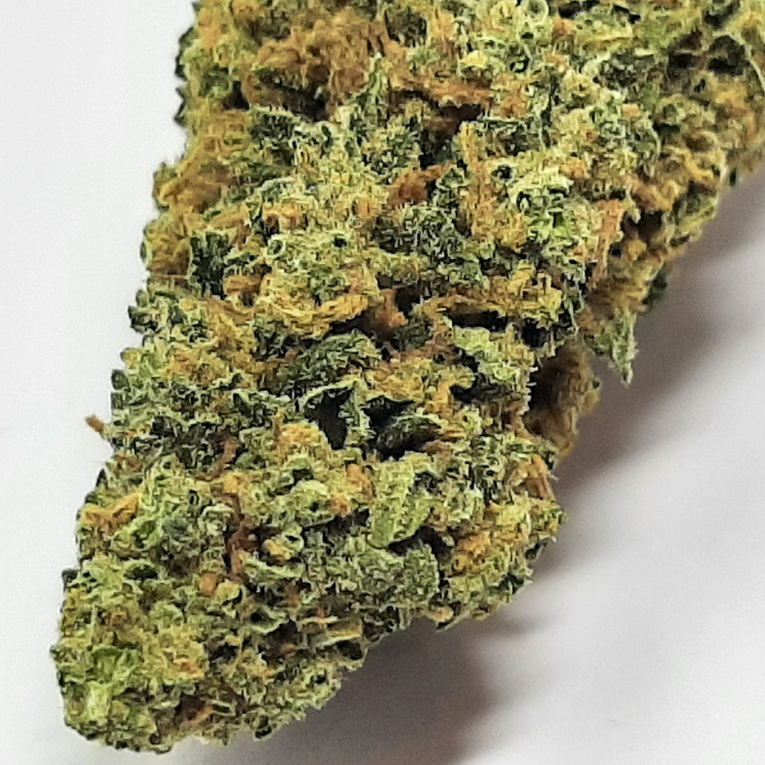 Alien OG, also known as “Alien OG Kush,” is an evenly balanced hybrid strain (50% indica/50% sativa) created through crossing the classic Tahoe OG X Alien Kush strains. Best known for its insane level of potency, Alien OG is the perfect bud for any experienced patients who appreciate a well-balanced high from head to toe. It starts with a buzzy cerebral lift that fills your brain with a happy sense of euphoria, leaving no room for any negative moods or racing thoughts. As your happiness expands, your body will begin to settle into an equally stimulating buzzy state that has you feeling fully relaxed from head to toe. Combined with its high 22-28% average THC level and 0-1% CBD level, these effects make Alien OG a great choice for treating chronic stress or anxiety, appetite loss or nausea, chronic pain and chronic fatigue. This bud has a sweet and sour citrusy lemon flavor with a lightly woody exhale. The aroma is earthy and herbal with a sweet lemony citrus overtone that intensifies in zest as you continue to toke. Alien OG buds have airy grape-shaped minty green nugs with olive leaves, thin orange hairs and a coating of frosty amber crystal trichomes.