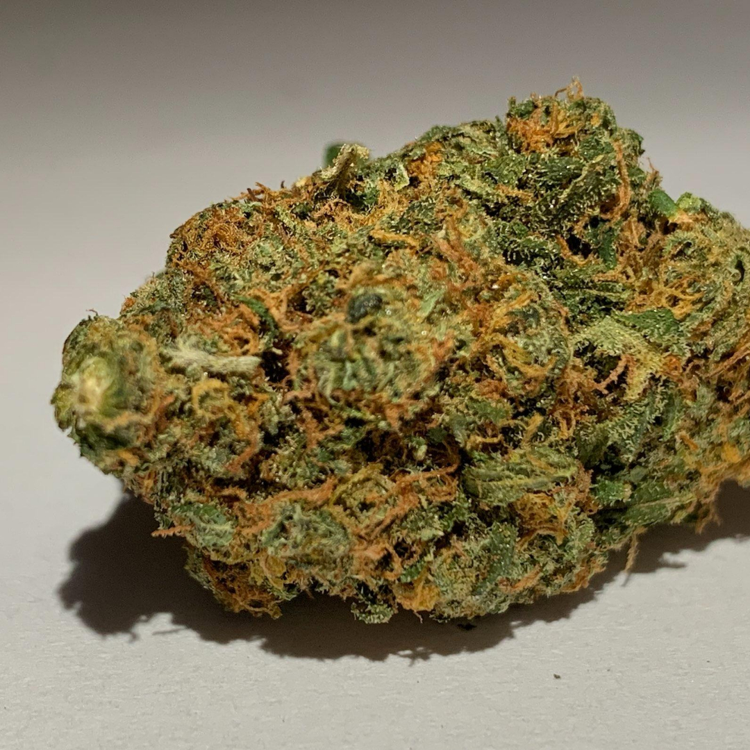 White Runtz is an evenly balanced hybrid strain (50% indica/50% sativa) created through crossing the classic Zkittlez X Gelato strains. Known for its super delicious flavor and long-lasting high, White Runtz is perfect for any hybrid lover. This bud packs a flavor much like its name suggests – sweet and sour fruity candy with a light touch of citrus. The aroma is very similar, with an earthy citrus overtone that’s accented by fresh sweet fruits. The White Runtz high is just as delicious as the flavor, with relaxing and long-lasting effects that will have you kicked back and feeling totally at ease in no time at all. It starts with a tingly effect in the spine and the back of the neck, which quickly works its way forward throughout the rest of your body. Thanks to these effects and its super high 23-24% average THC level, White Runtz is often chosen to treat those suffering from conditions such as chronic stress, muscle spasms or cramps, chronic stress or anxiety and chronic pain. White Runtz buds have spade-shaped oversized super thick forest green nugs with deep undertones, long thin reddish orange hairs and a coating of frosty tiny white crystal trichomes.